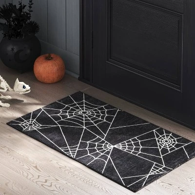 Add a scary vibe to your floor space with this Washable Spider Webs Scatter Woven Accent Rug from Hyde and EEK! Boutique™. Showcasing a haunting spider web pattern in white on a black backdrop, this woven accent rug adds festive flair to your floor space while blending easily with your existing decor. The woven rectangular rug features a low-pile construction that is suitable for use in high-traffic areas, while the latex backing helps keep the rug in place.