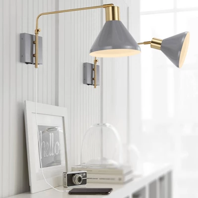 This wall light’s mid-century style is perfect for modern and minimalist interiors, especially guest rooms and resort rentals. Quality touches include a metal shade, rotating design, USB charging port and an elegant silk-wrapped cord. Takes 1 bulb and compatible with 9W LED or 60W TYPE “A” or 13W CFL. Eco-friendly 9W LED bulb included. Takes 1 bulb and compatible with TYPE “A” 60W or CFL 13W or LED 9W. Color Temperature: 2700K. CRI: 80. Before cleaning any lamp shade or fixture, disconnect the power source. Wipe with a soft, dry cloth. Avoid the use of chemicals and household cleaners as they may damage the finish.