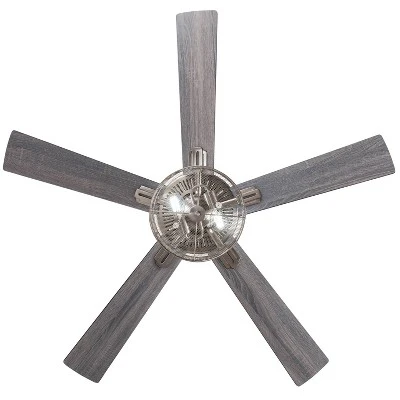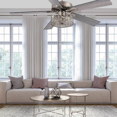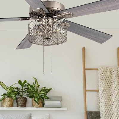 Add a bright, industrial-inspired gleam to your transitional decor with the 52 in. Satin Nickel Ceiling Fan With LED Lights from River of Goods. This satin nickel ceiling fan sports five blades in a soft gray or black finish, letting you reverse the blades to suit your color scheme, and the 41-watt motor has three speed settings controlled via pull chain to let you dial in the airflow. The light kit comes complete with two E26 type A LED bulbs for quick setup, and the silver drum shade has an open bottom and cutout, chevron-patterned sides for a touch of extra appeal. This reversible blade ceiling fan can be put up in a flush-mount installation or installed with the included 6-inch downrod, offering you two different height options to suit whatever space you choose to put it in.