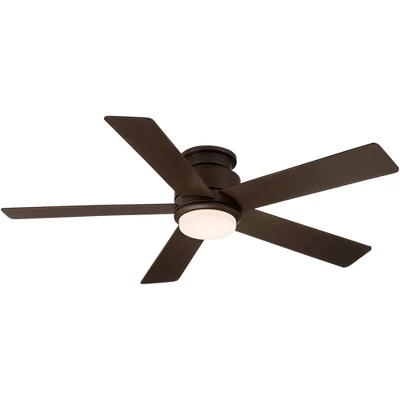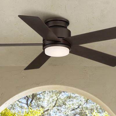 Use this oil rubbed bronze LED hugger ceiling fan inside or outside with its damp rating. The motor and five manufactured wood blades all feature a sleek bronze finish. White opal etched glass encloses the integrated dimmable energy-efficient LED light.