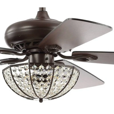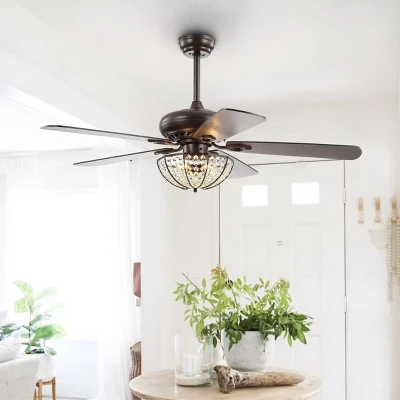Our 52″” Oiled Bronze fan combines rustic style and a touch of glam, featuring a domed cage light embellished with crystal drops. Five reversible blades provide plenty of air flow by remote control. Three LED bulbs provide bright, sparkling light. This fan-light combination’s crystal accents will dress up a rustic farmhouse living room, bedroom or family room. Remote control provides 3 different fan speeds. 5 included reversible blades in a Brown finish matched the Oiled Bronze metal. Fixture can be adjusted to your desired length. Eco-friendly 9W bulbs included. Takes 3 bulbs and compatible with any 9W LED or 40W TYPE “”A”” or 13W CFL. As this fixture must be hardwired, we recommend a professional electrician manage installation. Make sure the power is off before cleaning your fan. Because of the fan’s natural movement, some connections may become loose. Check the support connections, brackets, and blade attachments twice a year. Make sure they are secure. It is not necessary to remove the fan from the ceiling. Clean your fan periodically to help maintain its new appearance over the years. Do not use water when cleaning, as this could damage the motor or the wood, or possibly cause and electric shock. Use only a soft brush or lint-free cloth to avoid scratching the finish. The plating is sealed with a lacquer to minimize discoloration or tarnishing. You can apply a light coat of furniture polish to the wood for additional protection and enhanced beauty. Cover small scratches with a light application of shoe polish. You do not need to oil your fan. The motor has permanently-lubricated sealed ball bearings.