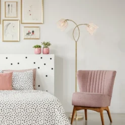 The 61″ H Meg Brushed Gold-Color Metal Candlestick Floor Lamp with Rattan Shades from River of Goods contributes the timeless, classic look of a cottage to your abode. This brushed-gold color candlestick floor lamp stands 67.5 inches tall and extends two arms to hold two white, bell-shaped rattan shades, adding a casual, relaxed vibe to a range of interior decor styles. The rattan shades’ open-weave design will create a glow when each of two 40-watt bulbs (not included) shine through. Use this light in your bedroom, your craft area, or in a kitchen or breakfast nook for the cozy, shabby-chic look you love.