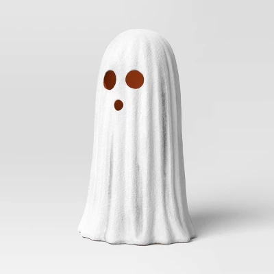 Add ghostly vibes to your festive home decor with this Large Textured Ghost Decorative Sculpture from Hyde and EEK! Boutique™. Crafted from terracotta material, this large decorative figurine comes in a ghost shape with carved-out eyes and nose in a textured matte white finish for eerie flair. Plus, the flat base makes it easy to place on any flat surface. Place it near your entryway or living room and pair it with other Halloween props to create a fun display in your haunted mansion.