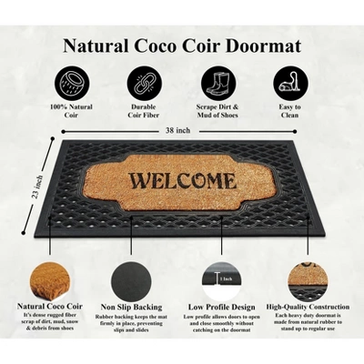 - ENVIRONMENTAL FRIENDLY OUTDOOR RUG: Made from 100% Hard Wearing Coir Eco friendly Rubber base . This Doormat adds a unique touch to your front door or back door while being very functional.