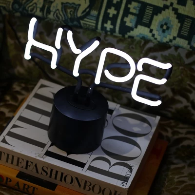 Amp it up or wind it down. Cast an ambient glow to your space with this Hype Neon Light . The desk LED neon signs glows bright white when turned on, that can give a pop of color to any room! Bringing the party good vibes neon sign! Amped & Co designs and manufactures trendy and unique neon lights. Desk lights and wall lights in both real neon and LED neon. This neon sign is made of glass and filled with real neon. Perfect addition for any room decor, great as gifts, and fun to see the vibrant and mesmerizing glow of real neon. The neon light glows when turned on, bright enough to light up your space as ambient or decorative lighting. Neon is encases in a white glass tube. The base has added weights for stability, and on/off switch, and includes