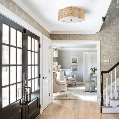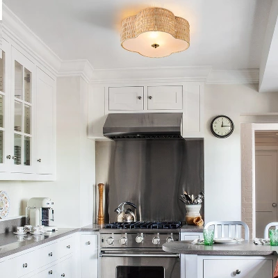 This 2-light flush mount has a rattan shade that effortlessly adds a coastal farmhouse look to your kitchen or entryway. Graceful curves plus metallic lines equal an elegant contemporary design with a gold accent. The rattan shade is capped with a glass diffuser that softens the glow from the two 60W bulbs (not included), create an even glow when light wafts through it. This fixture is compatible with a dimmer switch to effortlessly take you from your morning coffee to evening cocktails.