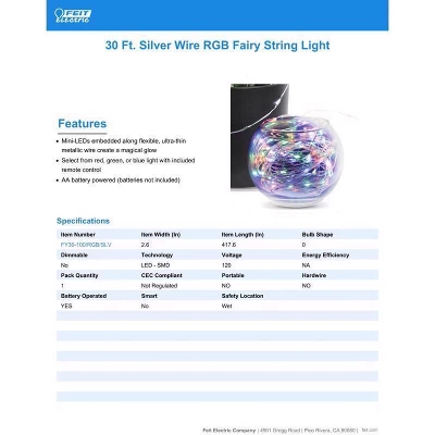 Add a touch of magic to any room in the house with this multi colored LED fairy string light from Feit Electric. Powered by three AA batteries or a USB, this 30 ft. silver-wire strand creates a glow perfect for creating that cozy feel. Lightweight and flexible, it can accentuate any room in the house or go into mason jars and lanterns for easy DIY outdoor ornaments. Use the included remote to turn the lights on or off, adjust brightness or select light modes like twinkling or glowing.
