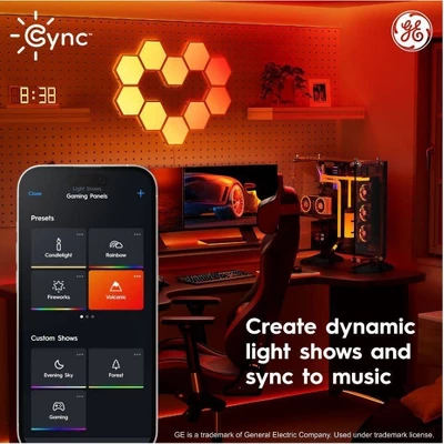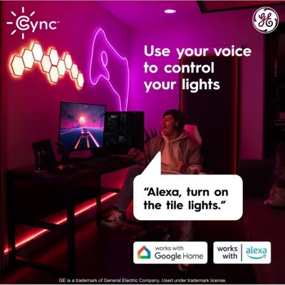 The Cync Full Color Dynamic Effects Hexagon Panel Light lets you install modern angular smart tiles to create a unique design. Create unique wall art by making shapes and organic designs with these wall tiles. The hexagon wall panels feature scheduling, light shows, music sync and millions of colors to enhance any space – no hub needed. Select from a wide range of white color tones from 2000K to 7000K and pinpoint the perfect white light. Choose from millions of additional colors to enhance the vibe in the room with these hexagon LED lights, ideal for entertaining and holiday décor. Get more out of your LED color changing lights with out of home control and scheduling through the intuitive Cync App, powered by Savant, and voice control when you pair these LED wall panels with Amazon Alexa or Google Home devices. These hexagon tiles come with a control box, power cord, linking cables, adhesive strips, traceless nails, screws, orientation tool, and panel remover tool.