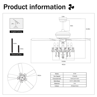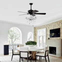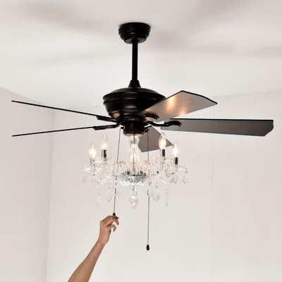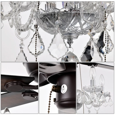 2” Crystal Shade Ceiling Fan Lamp ,3 Speed ,4 Timing , 5 Reversible Blades Crystal Ceiling Fan ,5PCS*E12 (NO Include Bulb) — Hand Pull Chain