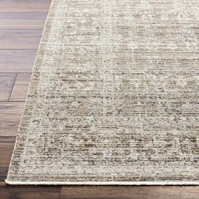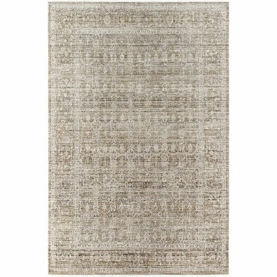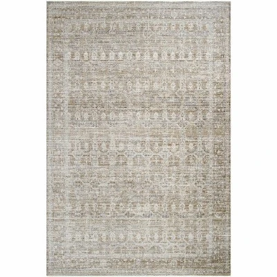Brand: Surya. Colors: Taupe, Charcoal, Gray, Dark Brown. Construction: Machine Woven. Material: 100% Polyester. Pile: Low Pile. Pile Height: 0.04″. Styles: Traditional. Outdoor Safe: Yes. Machine Washable: Yes. Made In: Turkey. Thickness: 0.12″. Fringe Length: 0.39″.