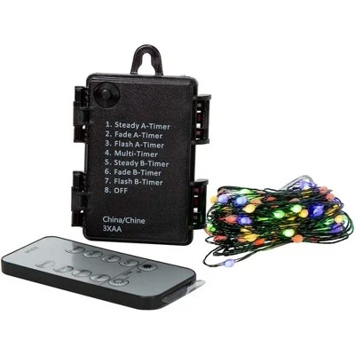 Kurt Adler battery operated string lights include one set of 50 dual-colored LED lights (warm white & multicolored) with two possible wire colors�silver or green�chosen at the shipper’s discretion. The lights feature 4-inch spacing between bulbs and are controlled with an 8-function remote and timer, offering a 6-hour on/18-hour off cycle. The total string length is 17.25 feet, with a 24-inch lead wire. Designed for both indoor and outdoor use, the string has a straight-line construction that ensures the remaining lights stay on if one bulb fails. The lights require 3 AA batteries (not included) and have non-replaceable bulbs. Multiple sets cannot be connected.