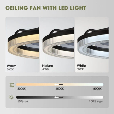 - [Dimmable & Memory Mode]The flush mount ceiling fan with lights has a dimming adjustment function, through remote control or APP control, 3-color temperatures ranging from warm light (3000k), natural light(4500K) to white light(6000k), brightness from 10% to 100%. All settings are memorized when turning off lights with remote control, no need to reset them next time.