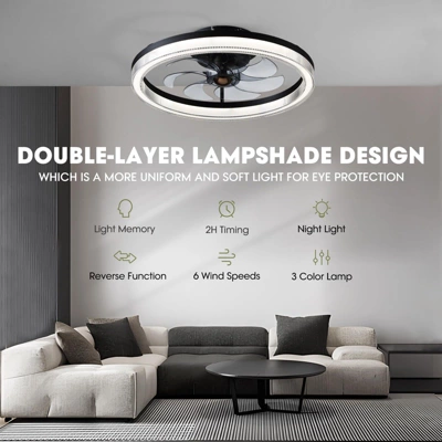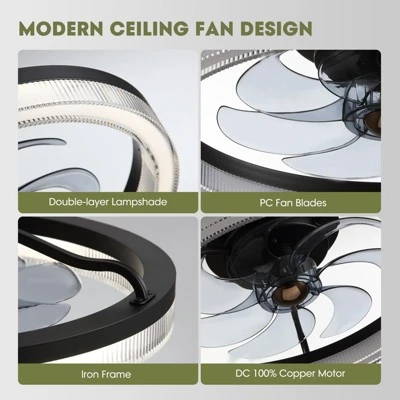 - [2 in 1 Modern Design]The modern low profile ceiling fan has quality LED light source and high transparent acrylic for higher light transmittance. Double-layer lampshade design, which is a more uniform and soft light for eye protection. Stylish outlooking design makes this ceiling fan a good home decoration.