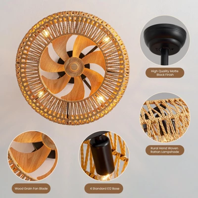 Introducing our Hand-Woven Low-Profile Ceiling Fan, meticulously crafted from natural abaca twine to add rustic charm to your space. The rattan lampshade emits warm, even light, making it perfect for farmhouse, vintage, or bohemian-inspired rooms. With E12 bulb compatibility, you can personalize your lighting experience. Measuring 20″ in width and available in heights of 13.4″ or 17.3″, it includes two down rods (4″ and 8″) for adjustable height and is suitable for sloped ceilings (≤22°). The wood-colored ABS blades rotate noiselessly, providing a refreshing downdraft in summer and a cozy updraft in winter. Easily control its six speed settings and a 4-hour timer with the included remote, allowing for separate operation of the fan and lights. Easy installation ensures a quick setup, and our team is available to assist with any queries.