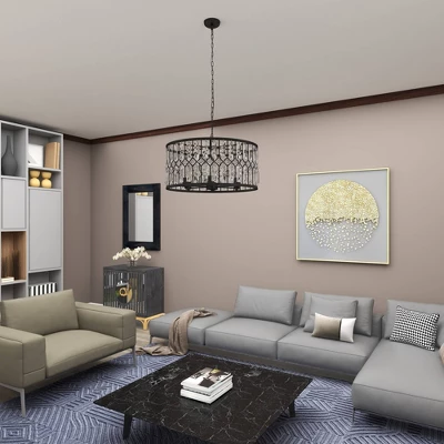 Maximize your ceiling space to add depth and dimensions in your home with this gorgeous chandelier. Beautifully designed and well crafted chandelier features eye catching structure for a mesmerizing focal point any where in your home. Use this black chandelier to cast light on your dining area or den. Requires 6 40W Type A E26/Medium (Standard) bulbs. This item ships in 1 carton. Hang decorative light with hardwired canopy and chain; nails and screws are not included. Suitable for indoor use only. Some assembly required. Includes a hardwire switch. This is a single black colored ceiling light. Glam style.
