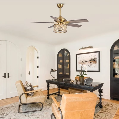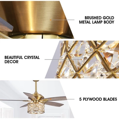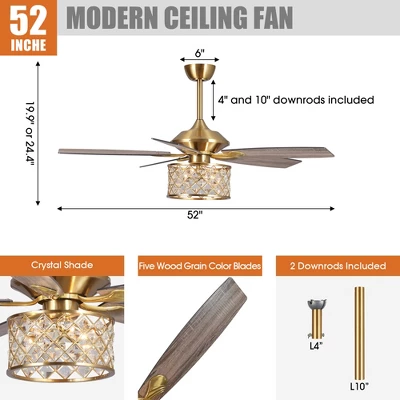 - This 52-inch Modern Ceiling Fan with clear crystal light combines beauty and functionality. The gold iron crystal cage shade provides a luxurious feast for the eyes