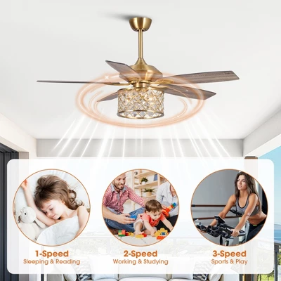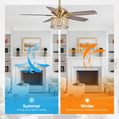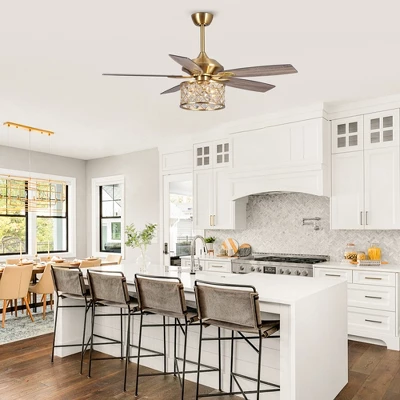 This 52-inch Modern Ceiling Fan with clear crystal lighting combines beauty and functionality. The Crystal Ceiling Fan can be used in the bedroom, living room, and kitchen. Three fan speeds and reversible blades can keep you comfortable all year round. In the summer, rotate the fan counterclockwise to keep cool. In the winter, push warm air downward by reversing the direction of the lighted ceiling fan.