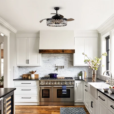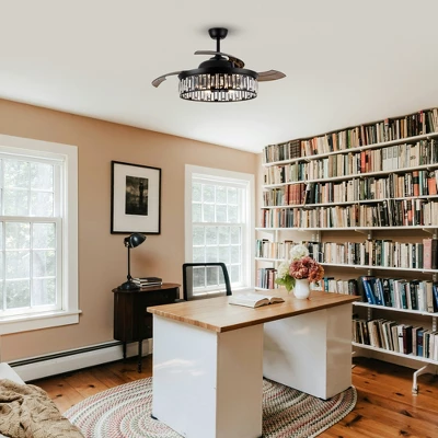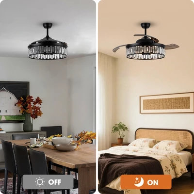 This modern industrial design 52 in. smart black ceiling fan adds a farmhouse statement and smart convenience to your home. 3 ABS Blades will stretch out and be put inside automatically when on/off, special design. The beveled tapered glass panels are arranged around a metal black-finished frame, 5-bulbs are required in total and included. Comes with a set smart remote control, but also supports Wi-Fi apps and Voice Control Technology (compatible with Alexa, Google Home Assistant and Siri) to offer more flexible operations.