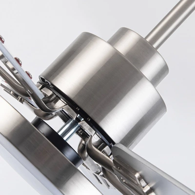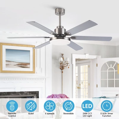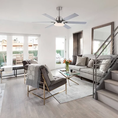 This modern fan, in nickel overall, is simple and harmonious, with no fancy colors. It comes with its own LED integrated bulb, and with the 60-inch fan blades, it allows for two-in-one lighting and air circulation. It is suitable for the living room, kitchen, and some other rooms. It comes with instructions for easy installation.