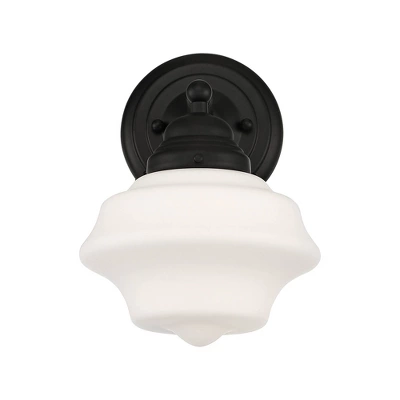 - Black finish over steel construction. Opal white schoolhouse glass. An ideal look for a bath, hallway, or entry area.