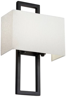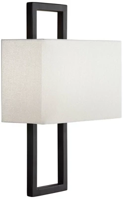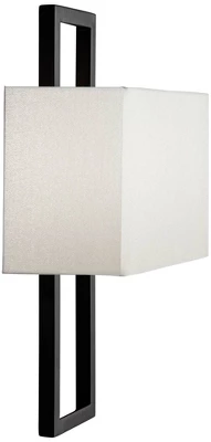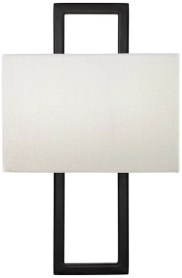 This set of two modern wall sconces is as beautiful as it is simple. An open rectangular frame in a black finish is paired with a horizontal rectangle half-shade for a light, airy look. The shade is made of a shimmery faux silk material that is designed to catch the light. Designed to take two bulbs, it provides excellent lighting for a hallway, bedroom, or bathroom space.
