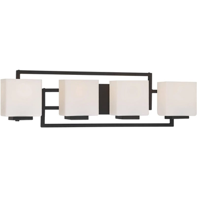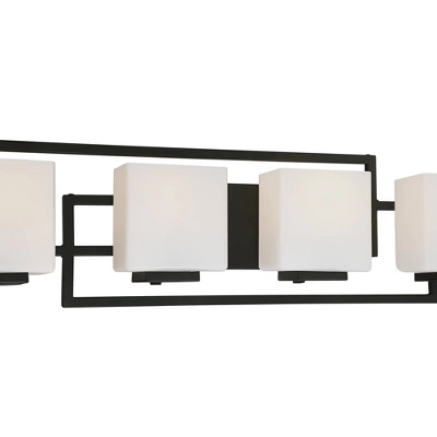 This four-light bathroom wall light features sleek lines for a contemporary appeal. The rectangular shades of opal glass are positioned to complement the geometric form of this design. It’s a great fixture to lend a modern update to your stylish bath. This is an ADA compliant bath light.