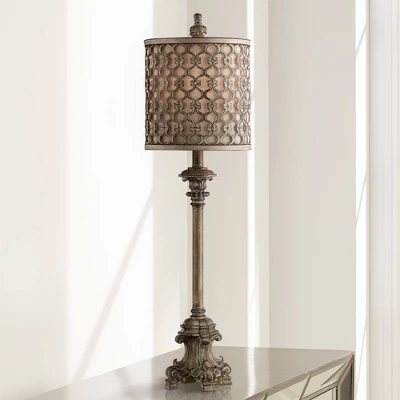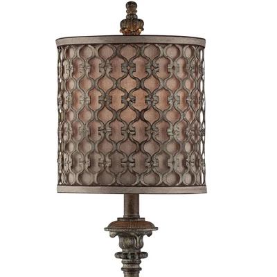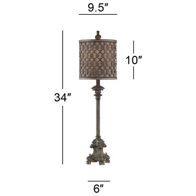 A metal lattice frame surrounds the cylindrical shade of this buffet lamp and gives its traditional look an elegant touch. The base features scrolled footing and a classic candlestick design. An ornate finial adds refinement.