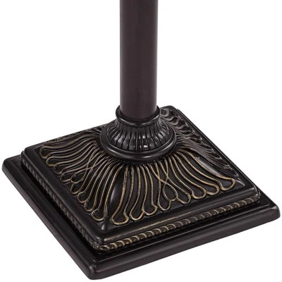 - Traditional torchiere floor lamp with reading light. From the Regency Hill brand. Oil-rubbed bronze finish. Metal and resin construction base. Amber glass. 8-foot long cord.