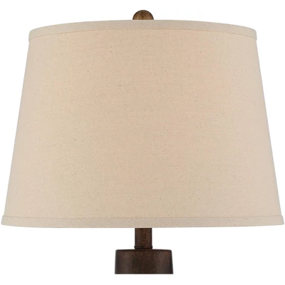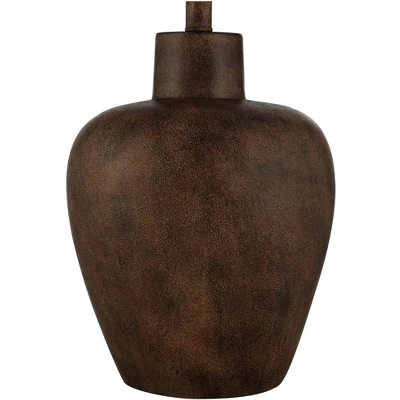 - Dark terra cotta finish. Cast resin construction. Tapered fabric drum shade.