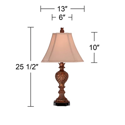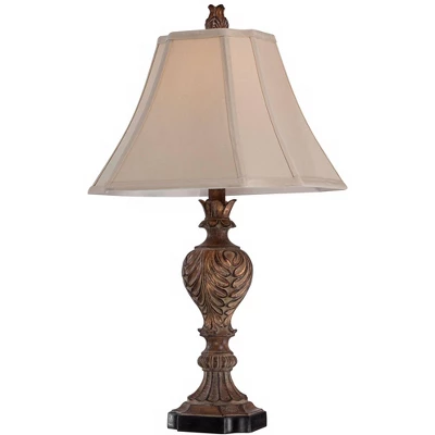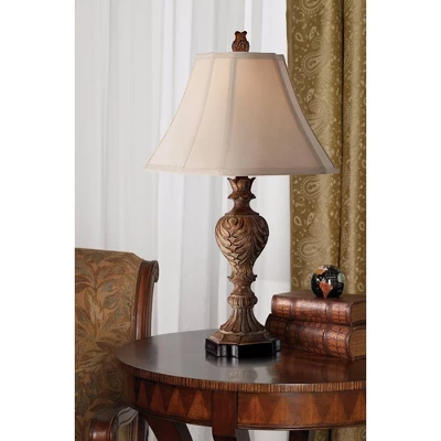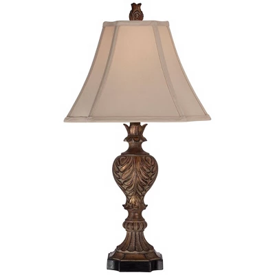 This traditional table lamp is fit for a regal castle but will add charm and style to any classic home. The aged brown finish base is carved in beautifully detailed acanthus leaf style. The bottom of the base features a deep espresso finish that adds a touch of contrast and interest. A tan sheer fabric square shade completes the look.