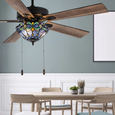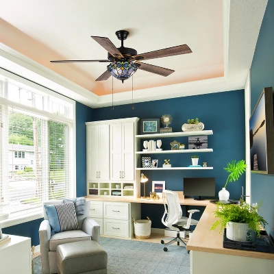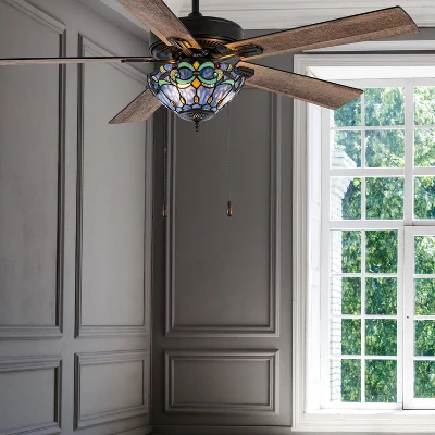 If you’re in the market for a new ceiling fan, this 52″ W Pipa 5-Blade Remote-Controlled Ceiling Fan from River of Goods offers you a standout option. This elegant 5-blade fan features a blue, aqua and amber textured glass bowl shade with 26 cabochons, rich barnwood/light driftwood MDF blades and an oil rubbed bronze-finish metal fixture. It lights up with three E12 bulbs (included), and is powered by a pull chain and a convenient remote that requires two AAA batteries (included). Best of all, the included 6″ down rod lets you set the drop height from 15 to 20 inches to best fit your space.