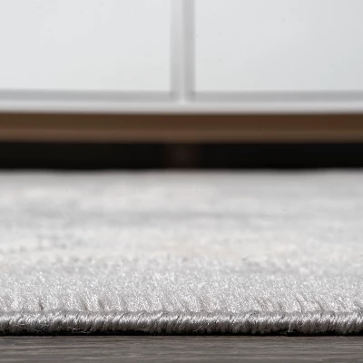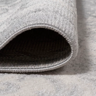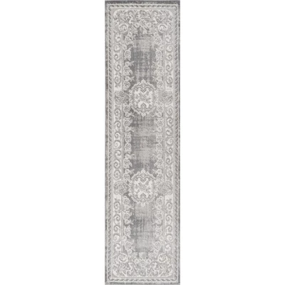 This ornate medallion rug has a scroll and floral pattern, adding modern Bohemian cottage style to a living room, bedroom, entry or kitchen. Varied tones of gray on an ivory background give this rug a hand-woven, rustic look. The busy allover pattern is pet-friendly and great for kids too.