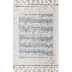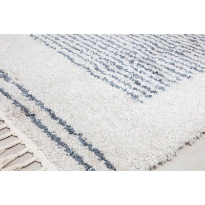 - This creamy white and soft blue-gray rug adds warmth and subtle allure to any space. Featuring fine stripes that take upon a rectangular shape, this modern design is immaculate and irresistible. An elegant tassel trim makes for a chic element that is both eye-catching and dynamic. Exuding a luxe energy, this rug needed a texture to match; this is why this floor accessory has a supple shag pile that feels like the ultimate comfort.