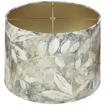 This drum shade features a pattern inspired by the natural world, perfect for bringing a touch of the outdoors into your home. Featuring muted natural tones on luxurious velvet, the shade boasts a subtle beauty with a classy leaf design. For your convenience, a gold finish spider and nine-inch harp are included. Design from the Springcrest Collection.