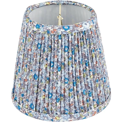 Brighten the look of a chandelier or lamp with this set of 4 clip-on lamp shades from the Springcrest brand. The shades have a tight shirred pleat using a blue floral leaf patterned fabric. The decorative leaf pattern is set against an off-white cream color background, and the shade has a white polystyrene liner. The metal clip fitter is in a polished brass finish.