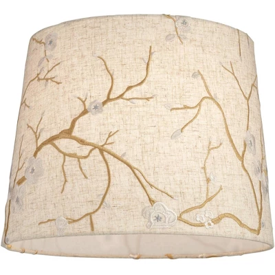 Graceful blooms and branches decorate the surface of this charming hardback drum lamp shade. Constructed with linen blend fabric, its embroidered pattern boasts a pretty branch and floral theme on a beige background. An unlined design and rolled trim complete elegant design elements. By the Springcrest Collection brand of lamp shades.