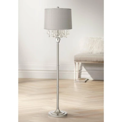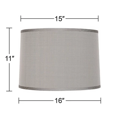 Cool and sophisticated, this modern drum shade offers sleek style update for your favorite lamp. It comes in a platinum grey faux silk fabric and has a slightly darker gray tone trim top and bottom. This shade has a spider fitting and is an unlined, hardback style. From the Springcrest Collection brand of lamp shades. The correct size harp and a finial are included free with this shade.