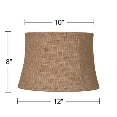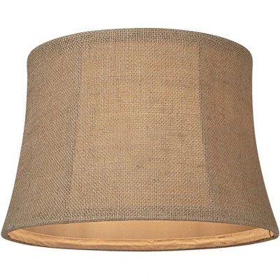 Natural burlap fabric on a set of two drum lamp shades lends casual style that’s inviting and relaxing. Each large size softback drum shade features tan polyester lining and a chrome finish spider fitter. The shades come with correctly sized harps and finials for a complete look.