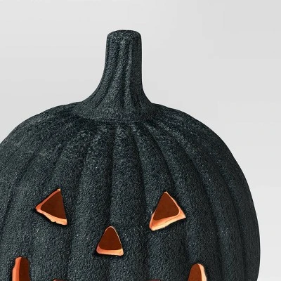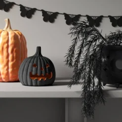 Bring a creepy yet playful touch to your home decor with this Textured Large Jack O’ Lantern Decorative Sculpture from Hyde and EEK! Boutique™. Crafted from terracotta material, this large decorative figurine comes in a jack-o’-lantern pumpkin shape in a textured matte black finish for eerie flair. Plus, the flat base makes it easy to place on any flat surface. Place it near your entryway or living room and pair it with other Halloween props to create a fun display in your haunted mansion.