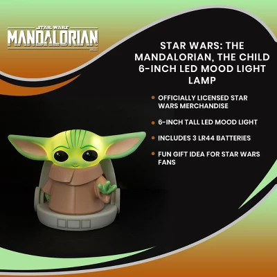 - FUN DESIGN: Measuring 6 inches tall, this sculpted mood light depicts the adorable Child, better know to legions of fans as Baby Yoda! 10-minute auto-shutoff feature makes it a great nightlight.