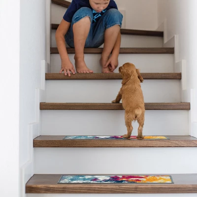 Enrich your stairs with these stunning, yet practical and decorative stair treads. The distressed abstract design adds interest and style to every step. The rubber backing provides additional safety for climbing kids and pets. At 26 inches x 8.6 inches, these machine washable treads are ideally sized for the majority of staircases.